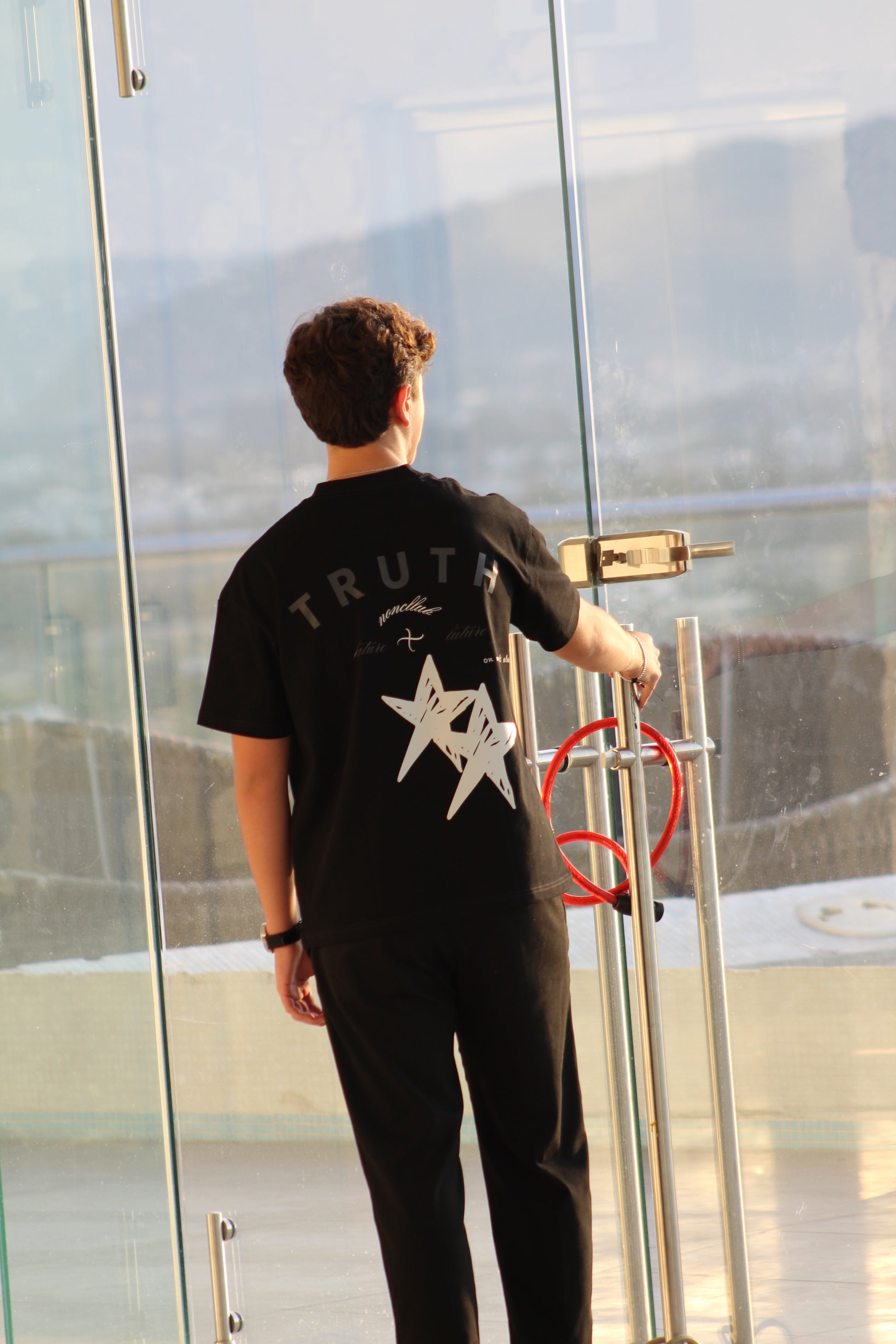 Playera negra de corte moderno con dos estrellas rotas en la parte de atrás y la palabra "T R U T H" en la parte superior, una pieza que simboliza la rebeldía y la búsqueda de la verdad, al estilo de Noncllub.
